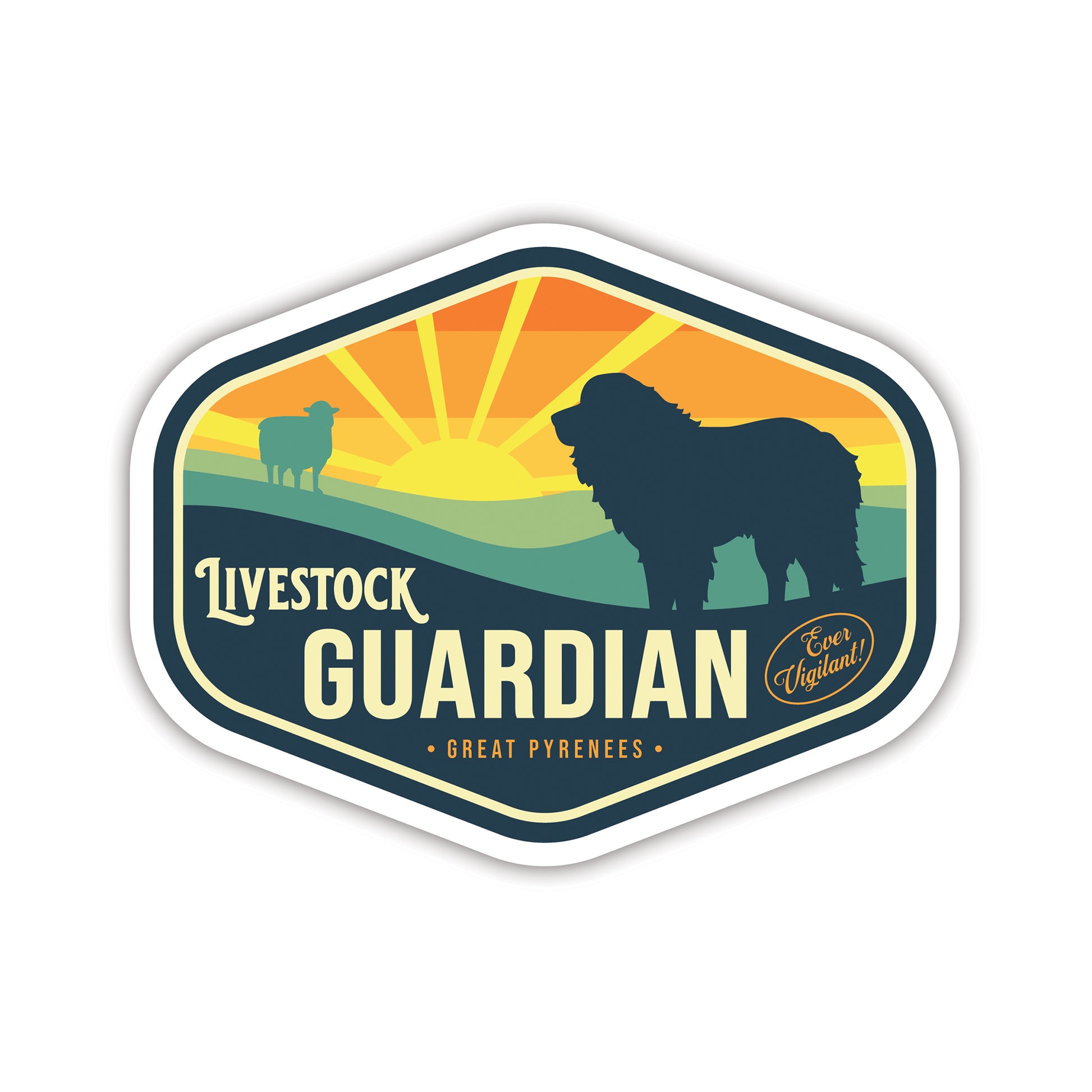 This sticker features the dog watching over his charge with the slogan "Ever Vigilant". With a colourful patch-like design in blue and orange tones, it has a charming appeal that is sure to please anyone with a soft spot for these magnificent working dogs.