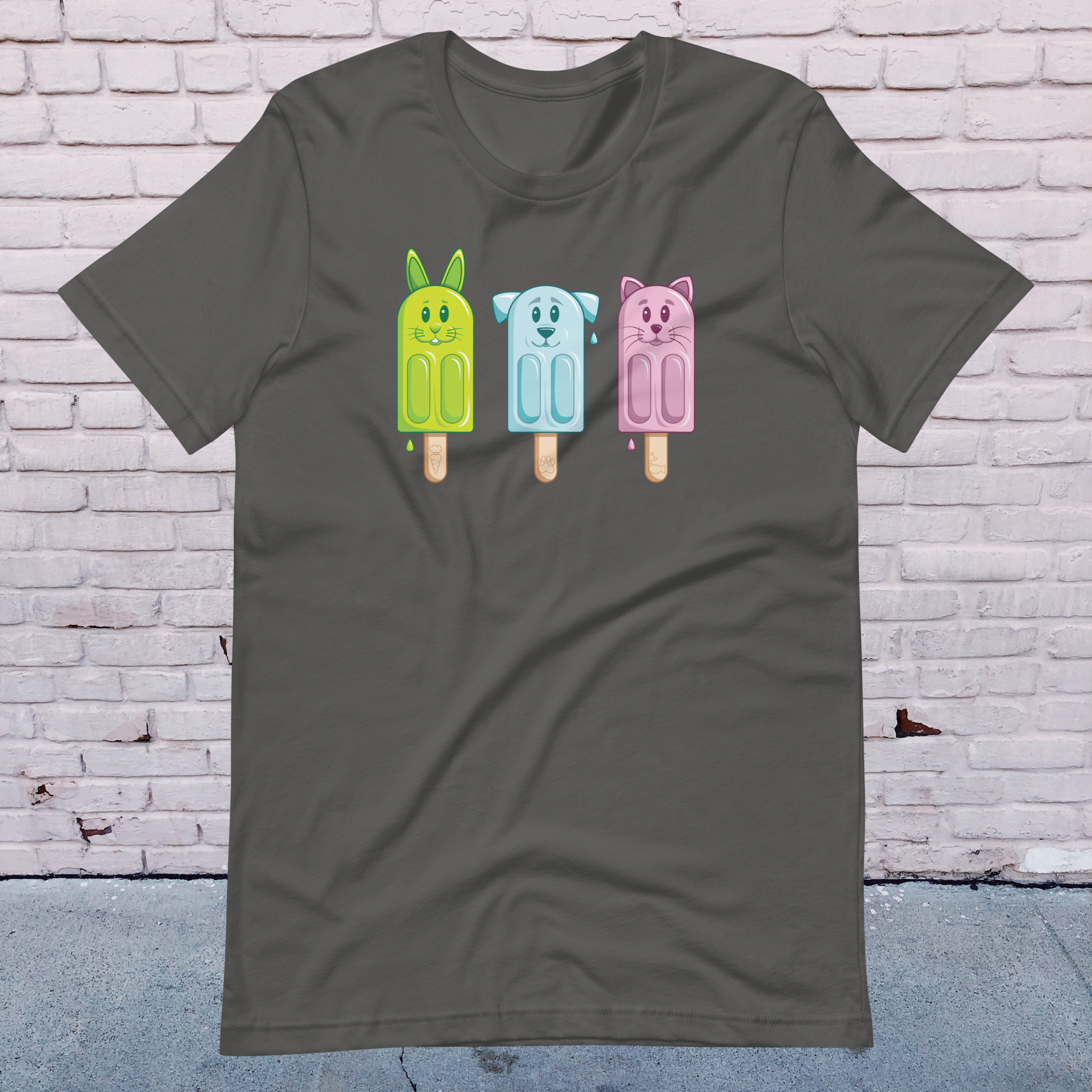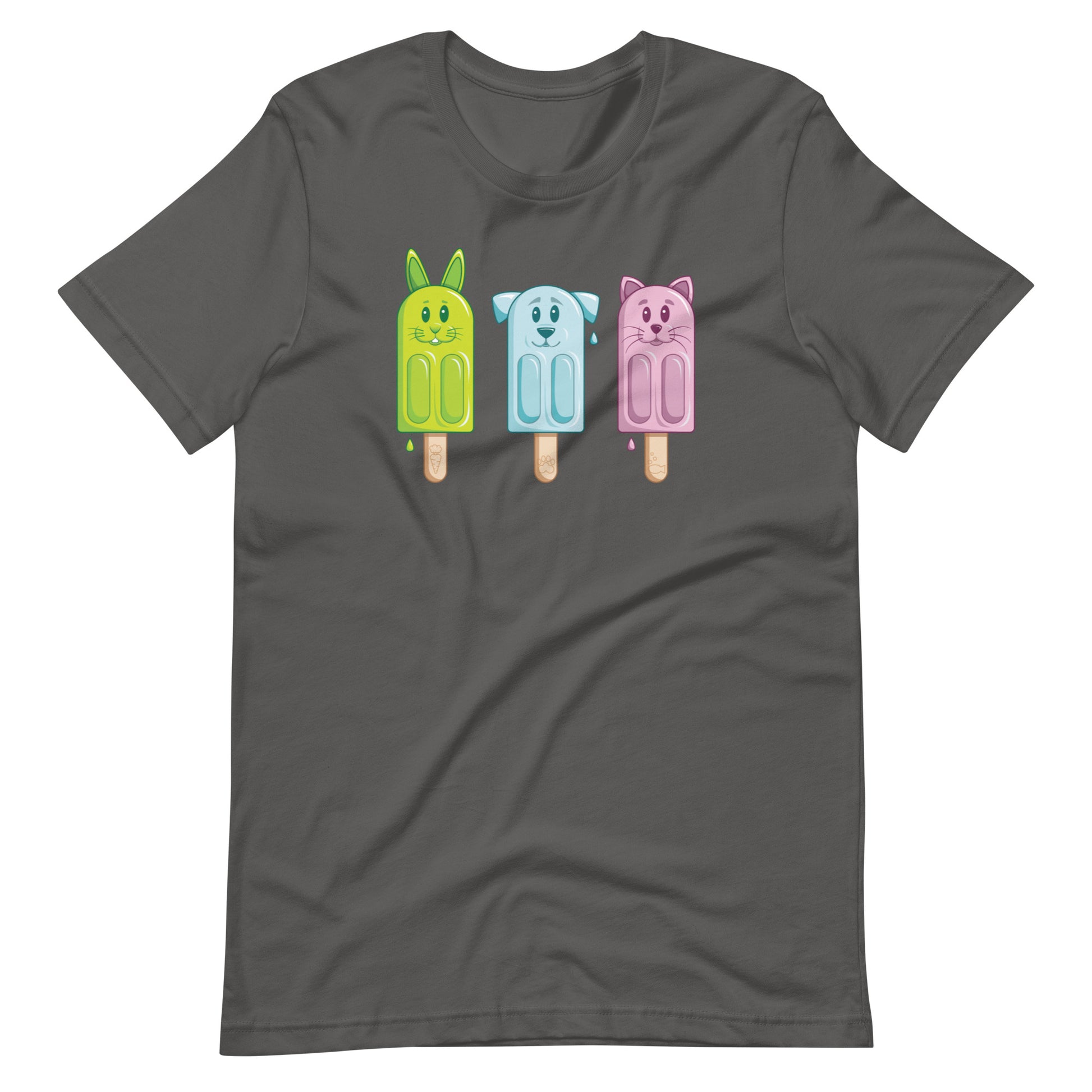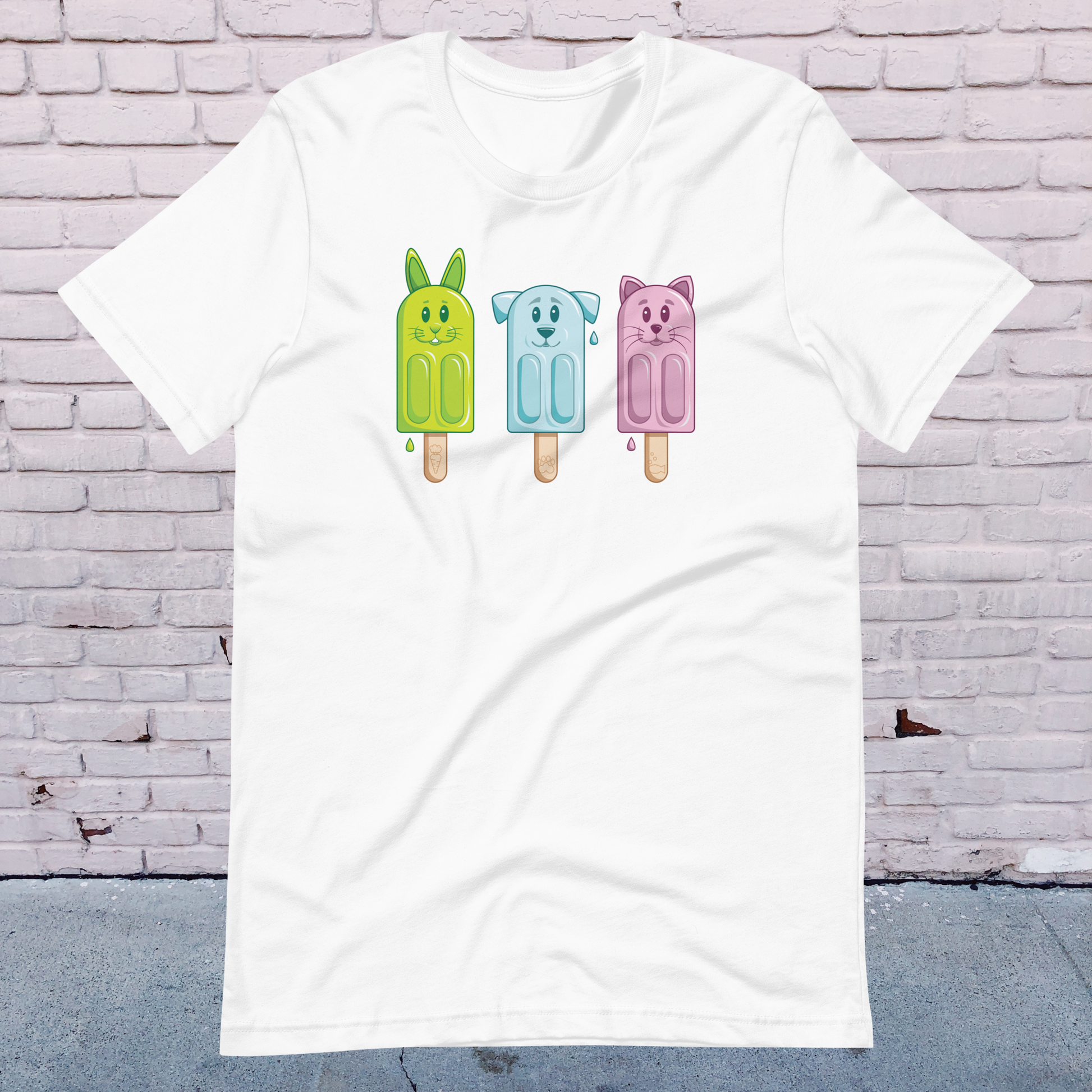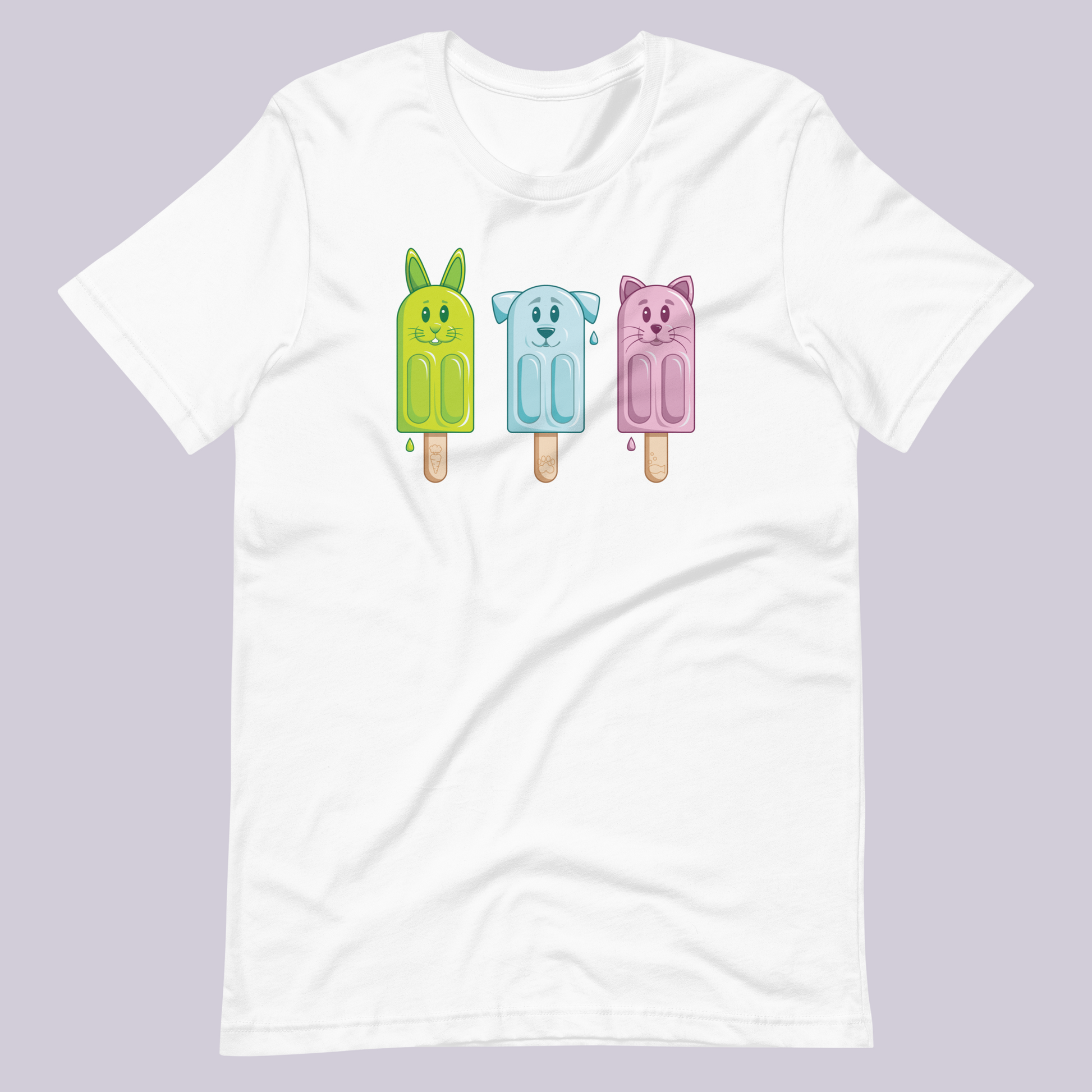 Add a touch of fun to your wardrobe with our Petsicle T-Shirt featuring adorable popsicle versions of a dog, cat, and bunny. The vibrant colours add a playful touch to this unique animal-themed tee.